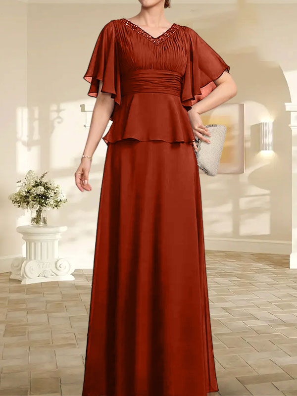 A-Linie, V-Ausschnitt, bodenlanges Chiffonkleid für die Brautmutter mit plissierter Perlenstickerei