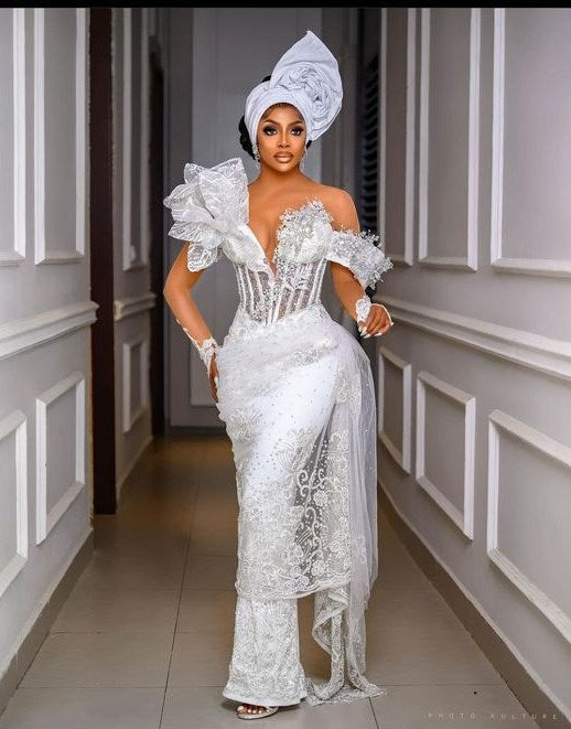 Asymmetrisches Meerjungfrau-Spitzen-Ballkleid mit luxuriösen Perlen