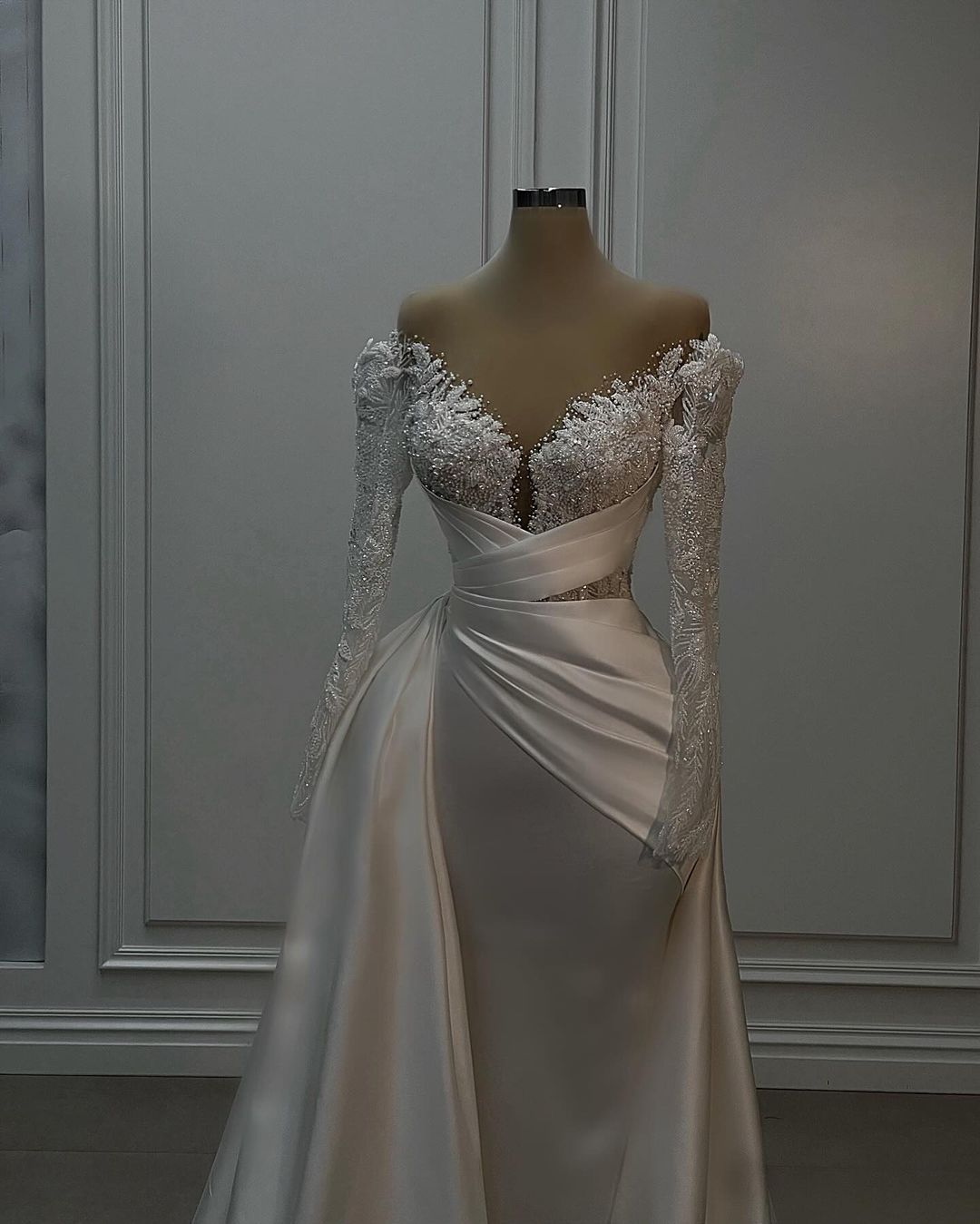 Wunderschönes langes weißes A-Linien-Brautkleid aus Spitzensatin mit langen Ärmeln