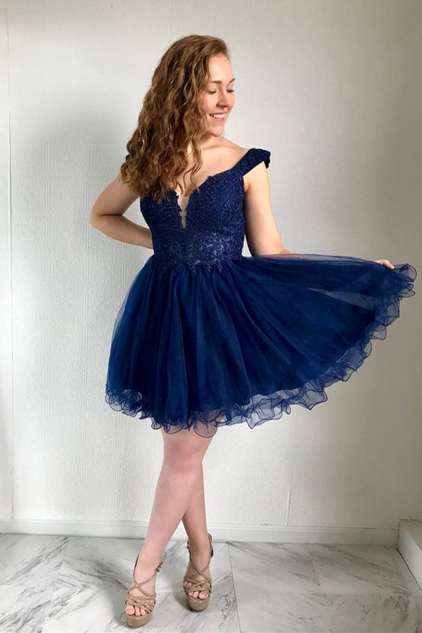 Günstige A-Linie Marineblau Spitze V-Ausschnitt Homecoming Kleider