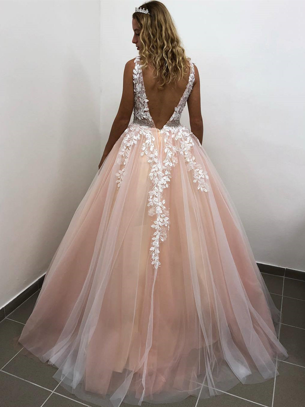 Dieses elegante, lange A-Linien-Ballkleid besticht durch einen klassischen V-Ausschnitt, zarten Tüll und Spitzenstoff sowie ein atemberaubendes rückenfreies Design. Perfekt für jeden formellen Anlass. Dieses Kleid vereint zeitlosen Stil mit moderner Eleganz. Mit diesem exquisiten Kleid werden Sie zum Star des Balls.
