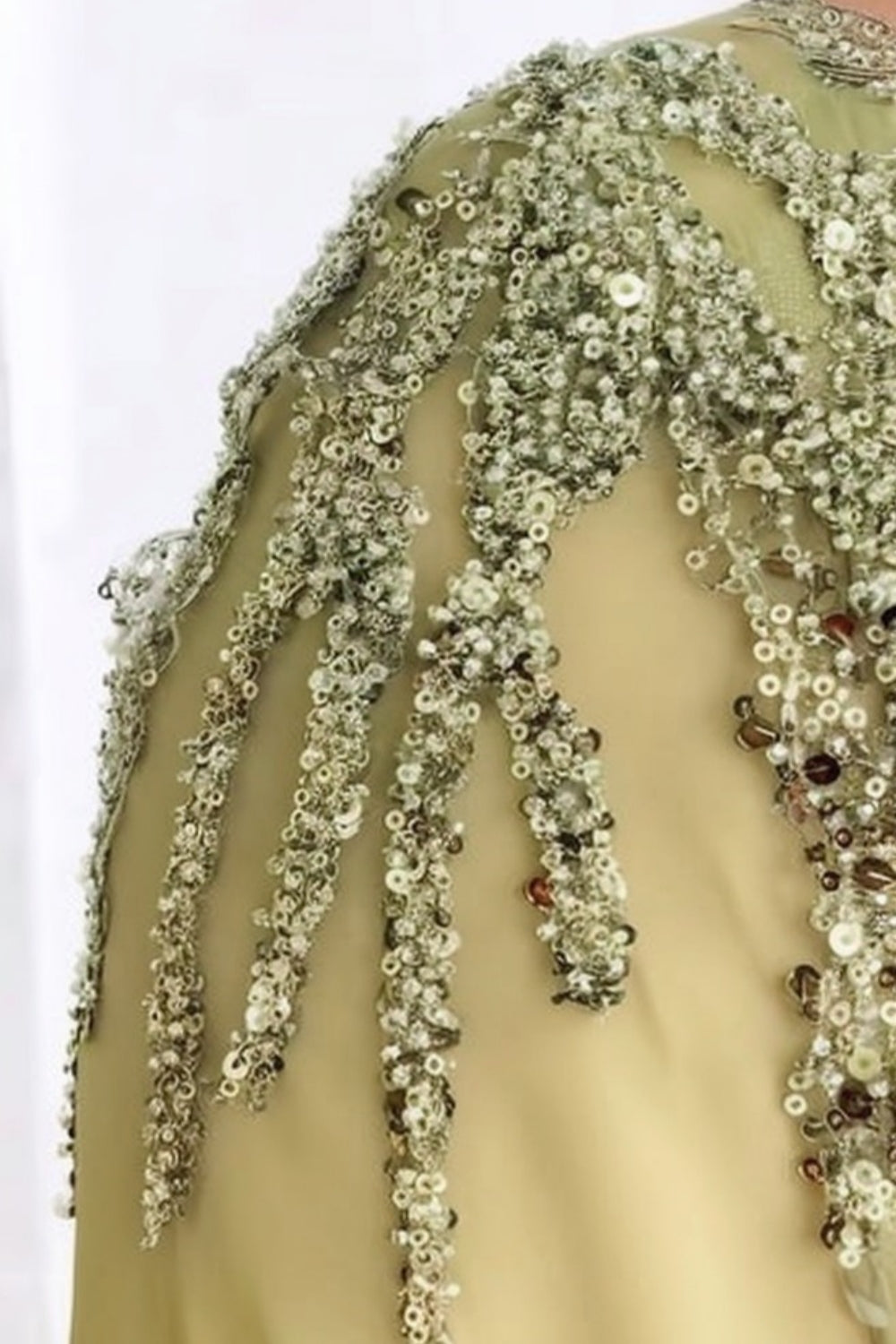 Erleben Sie Eleganz und Raffinesse in unserem glamourösen, langen, salbeigrünen Meerjungfrauen-Abendkleid mit V-Ausschnitt und Perlenbesatz. Dieses atemberaubende Kleid besticht durch aufwendige Spitze und zarte Perlenbesatz. Es unterstreicht die Meerjungfrauen-Silhouette perfekt. Der V-Ausschnitt verleiht diesem bezaubernden Kleid einen Hauch von Charme und macht Sie bei jedem Event zum Blickfang.