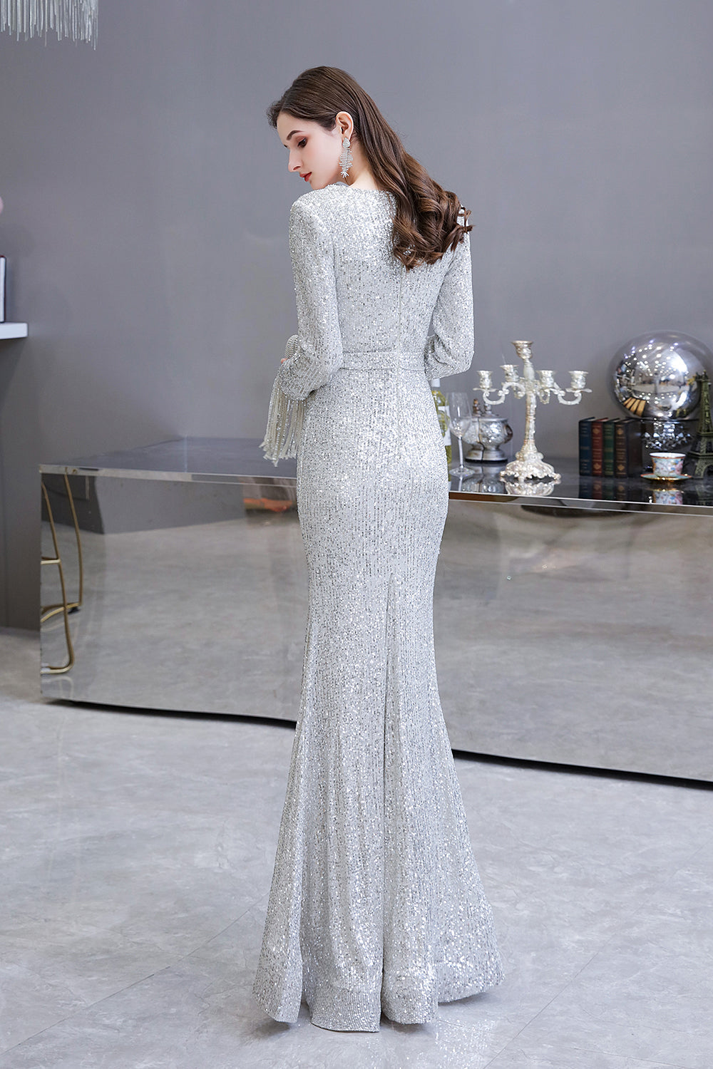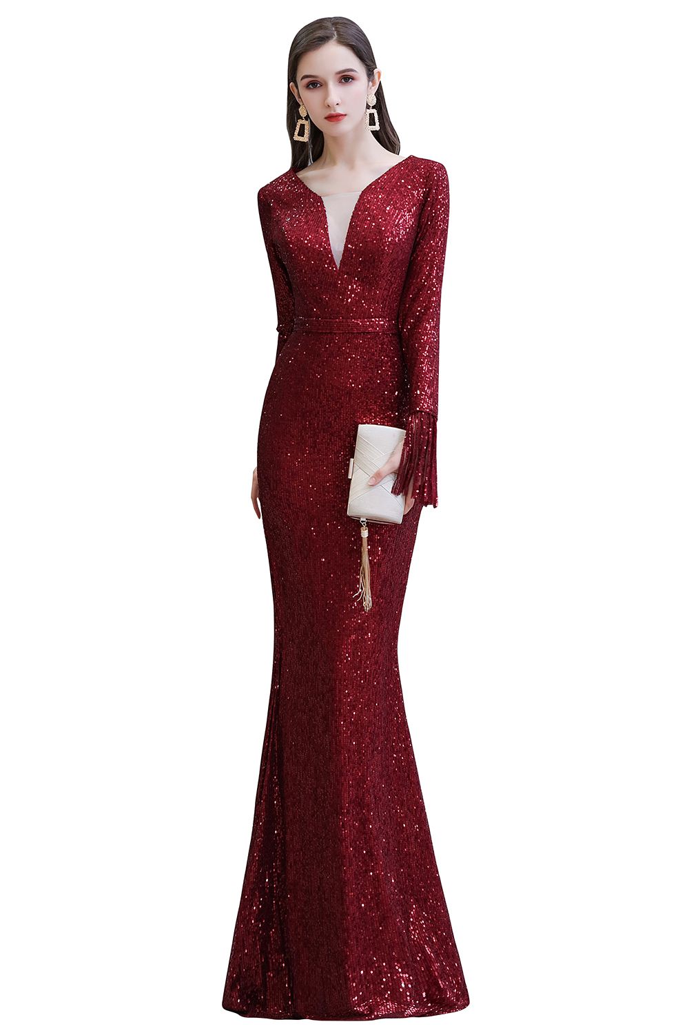 Wunderschöne Pailletten Langarm V-Ausschnitt Meerjungfrau Abendkleider