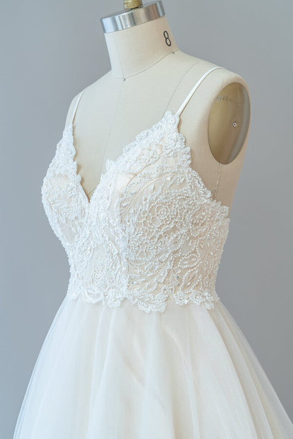 Langes rückenfreies A-Linien-Brautkleid mit Spaghettiträgern und Spitze