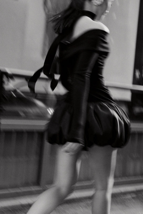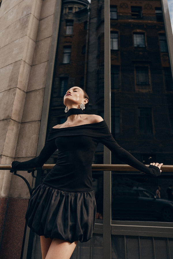 Verspieltes Minikleid aus einer Kombination zweier Materialien. Das Kleid hat ein elastisches Oberteil mit offenen Schultern und taillierten langen Ärmeln sowie einen voluminösen Ballonrock.