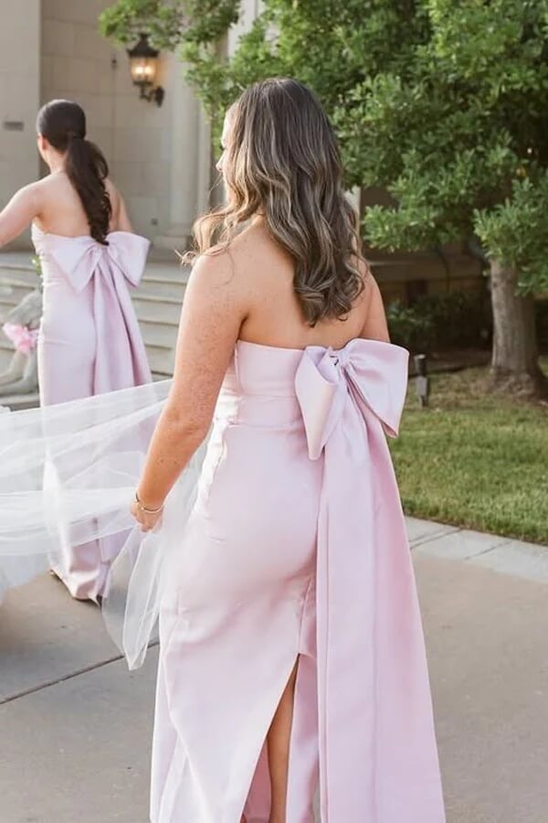 - Rosa, trägerloses, bodenlanges Brautjungfernkleid aus Satin mit Schleife.