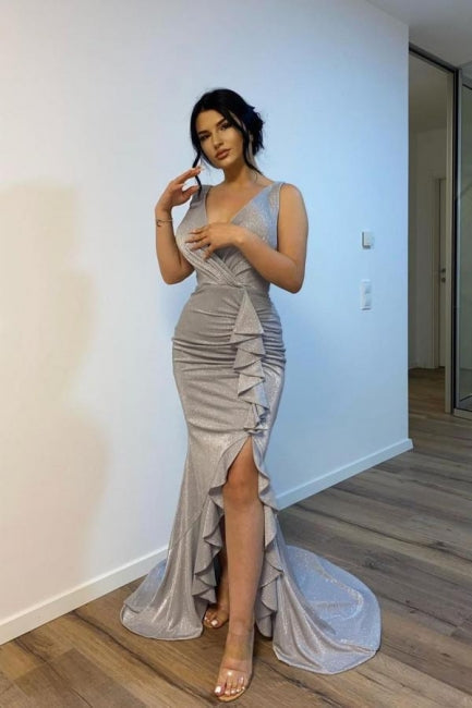 Silbernes langes Meerjungfrau-Ballkleid mit V-Ausschnitt und Rüschen und Glitzer