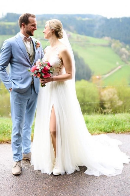 Schlichtes langes weißes A-Linien-Brautkleid mit V-Ausschnitt, ärmellos, Tüllspitze und Schlitz