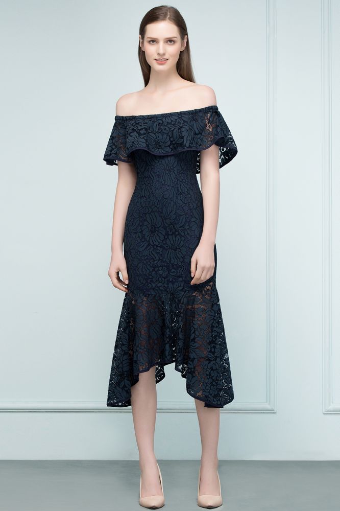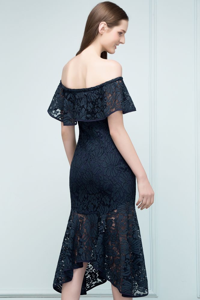 Teelange schwarze Meerjungfrau-Ballkleider mit schulterfreiem Spitzenabschluss