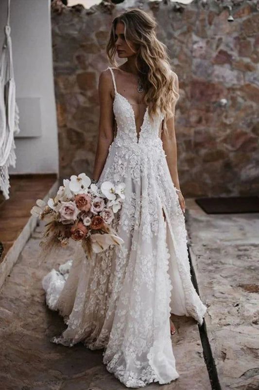 Vestido de novia bohemio de playa con tirantes en forma de A y encaje con abertura