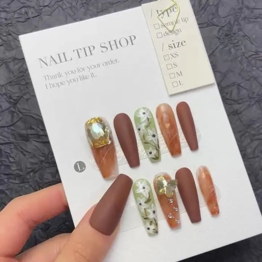 Nuevo estilo de uñas postizas marrones mate con purpurina y diamantes de imitación, estilo ballet de lujo, hechas a mano.