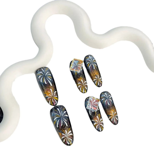 Nuevas uñas postizas ovaladas largas pintadas a mano con diseño de ojo de gato, efecto degradado fantasma, destellos de aurora, arcoíris y fuegos artificiales de Año Nuevo.