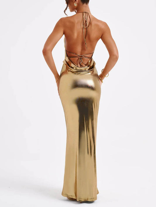 Vestido largo sin espalda con cuello halter y brillo metálico de primavera
