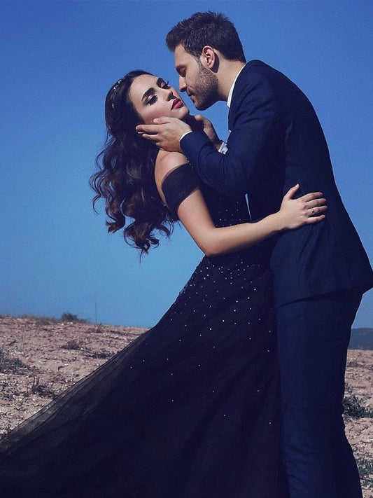 Vestidos de fiesta de tul con cuentas y hombros descubiertos, sin mangas y con vestido de baile