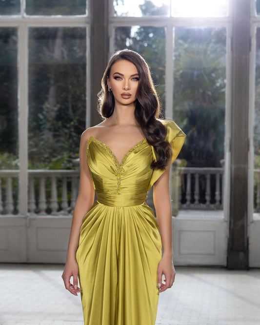 Hermoso vestido de fiesta plisado sin mangas con un solo hombro y cuentas