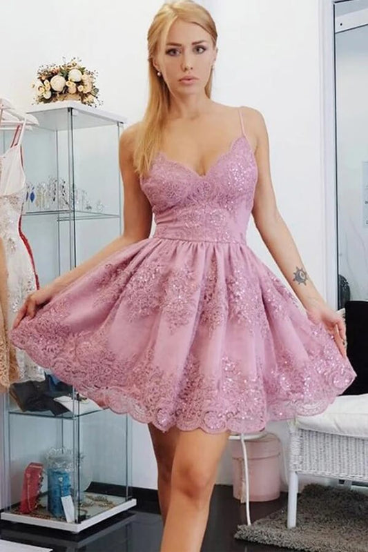 Vestidos cortos de fiesta de bienvenida con tirantes finos y encaje de corte A, vestido de graduación