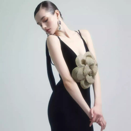 Vestido de fiesta de satén sin espalda con estampado floral 3D