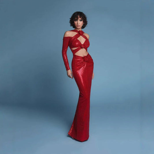 Vestido de fiesta con abertura y lentejuelas en los hombros