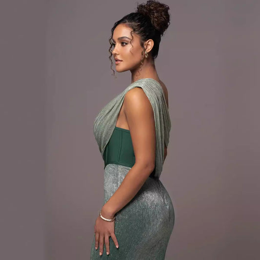 Vestido de fiesta fruncido con abertura y hombros descubiertos