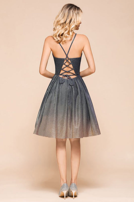 Vestido de fiesta corto sexy sin mangas con escote en V brillante y bolsillo para regreso a casa