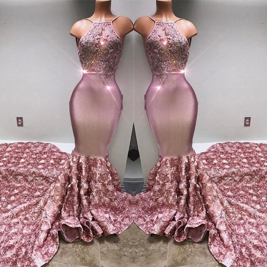 Glamoroso vestido de fiesta rosa de sirena con cuello halter y encaje con flores 3D en la parte inferior.