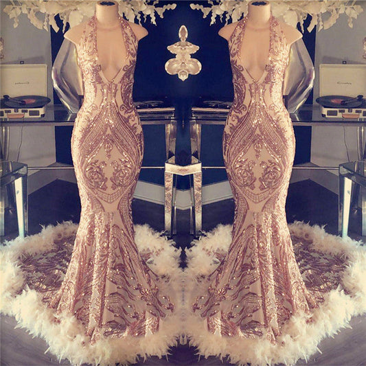 Elegante vestido de noche de sirena con cuello en V y apliques halter