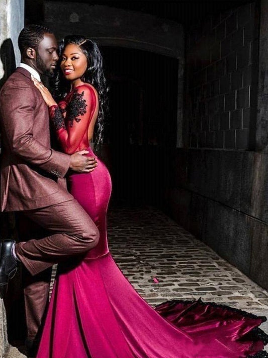 Hermosos vestidos de fiesta de sirena con mangas largas, cola barco, apliques de licra
