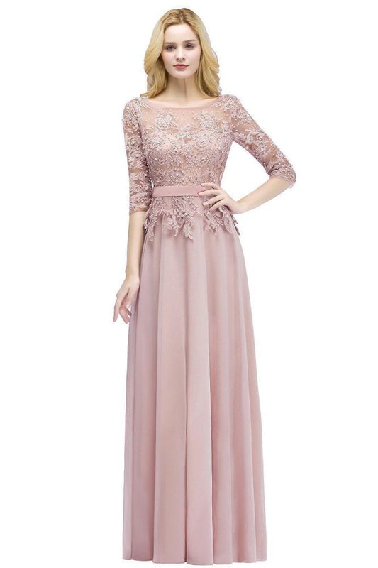 Vestidos de dama de honor con apliques, corte A, largo hasta el suelo, media manga y faja
