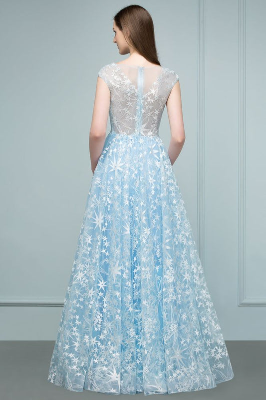 Vestidos de fiesta largos de tul con apliques y mangas casquillo en forma de A