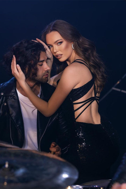 Elegante vestido de fiesta largo negro con hombros descubiertos, lentejuelas y encaje con abertura