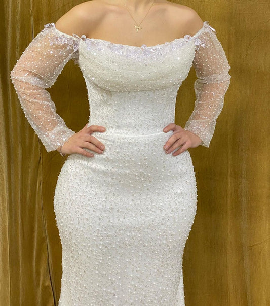 Elegante vestido de fiesta largo de sirena sin tirantes con cuentas y mangas largas