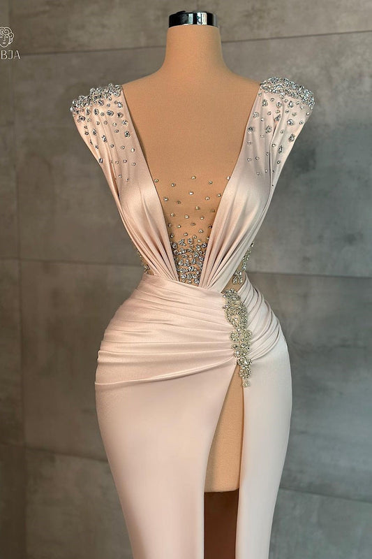 Vestido de fiesta de sirena sexy con escote en V largo y abertura frontal con diamantes de imitación