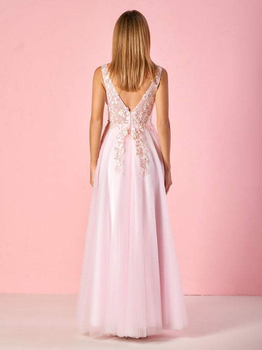 Vestido de fiesta largo hasta el suelo con tul, encaje y apliques con escote en V