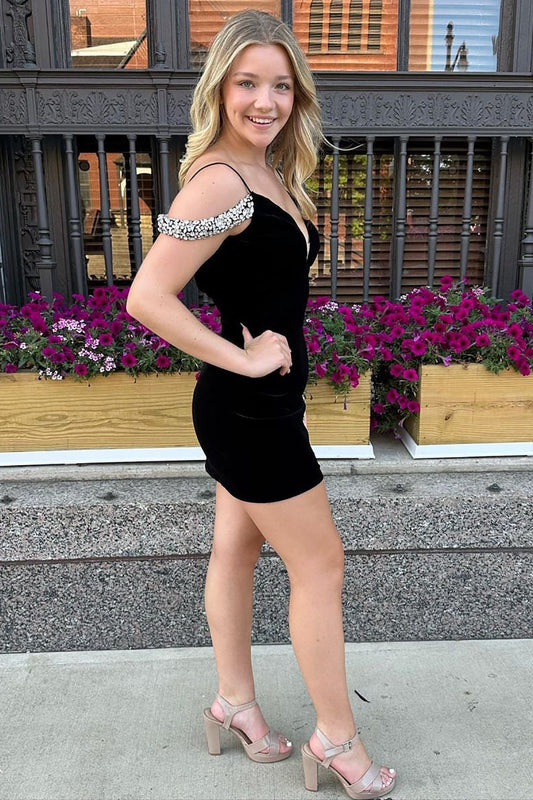 Vestido corto de fiesta con lentejuelas negras, hombros descubiertos y plumas