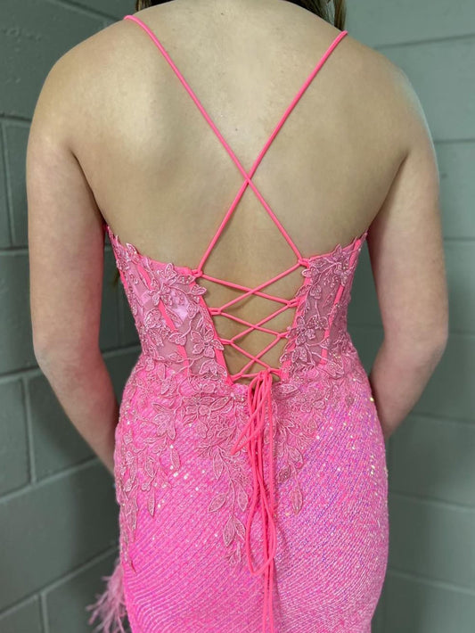 Elegante vestido de fiesta de sirena con escote en V y encaje rosa