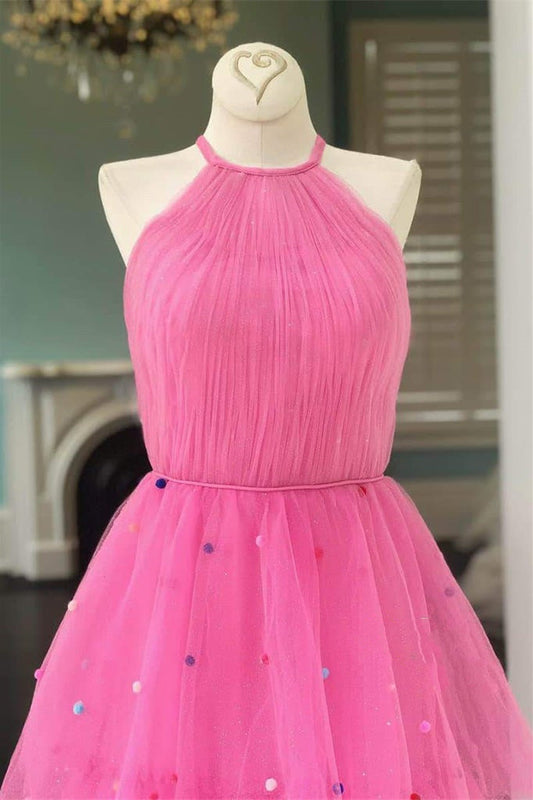 Roycebridal Tessa | Vestido de fiesta rosa intenso de tul con corte en A y lunares de colores