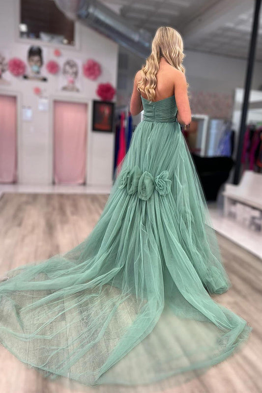 Vestidos de fiesta largos de tul con corte A y sin tirantes