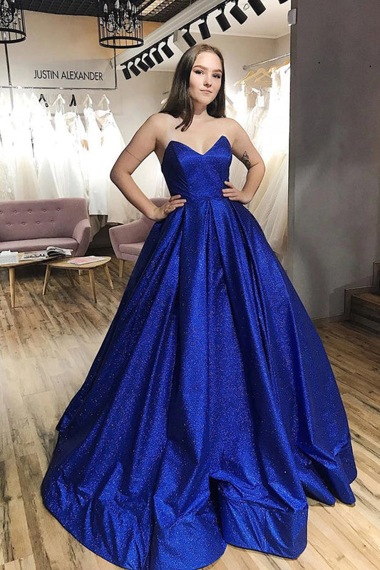 Vestido de fiesta de tul azul real brillante, sin tirantes, con escote en V, corte A y bolsillos