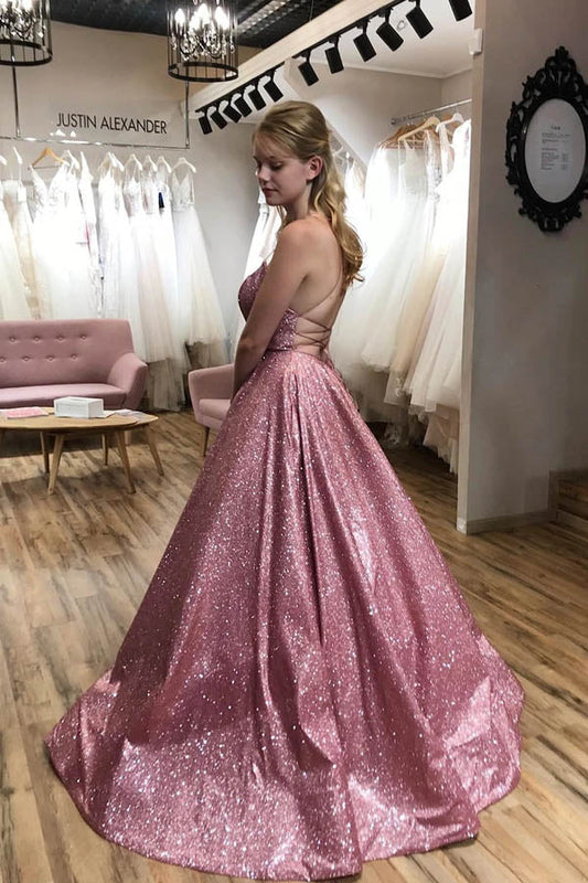 Vestido de fiesta brillante de corte A, escote en V profundo, tirantes finos, cola larga y bolsillos