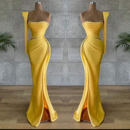 Vestido de fiesta amarillo largo de sirena con cuentas asimétricas de satén y mangas