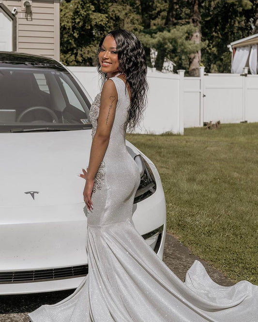Hermoso vestido de fiesta de sirena de satén elástico sin mangas con escote en V y lentejuelas con apliques