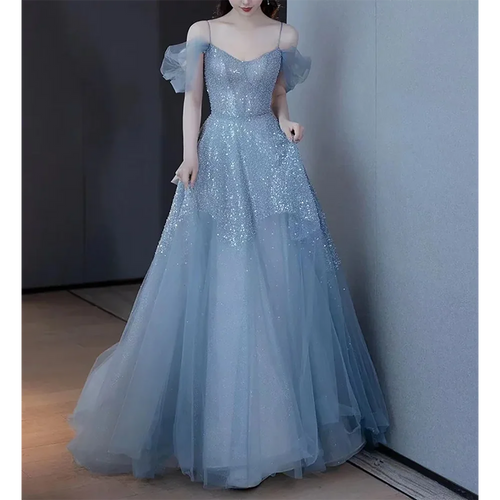 Vestido de noche lujoso azul con diamantes y capa LA73426 -