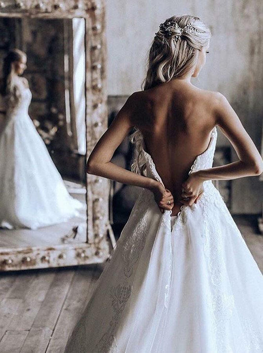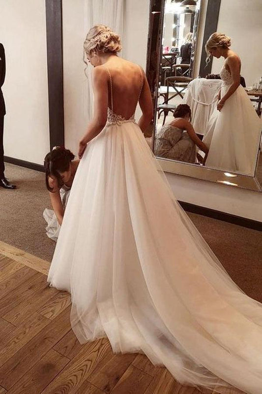 Vestido de novia blanco de corte A con escote en V profundo y espalda descubierta con apliques