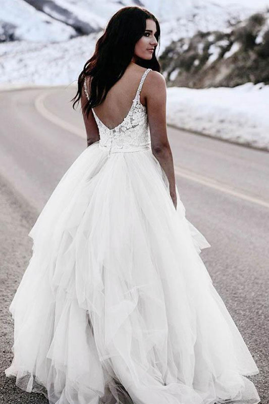 Vestidos de novia de corte A con tirantes, cola de corte, gasa, apliques y espalda descubierta