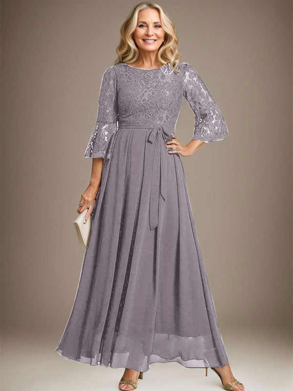Vestido de gasa con encaje y lazo para madre de la novia, corte A, escote redondo hasta los tobillos
