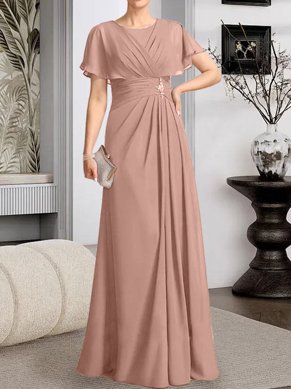 Vestido de gasa para madre de la novia con corte en A, escote redondo y largo hasta el suelo, con cuentas plisadas