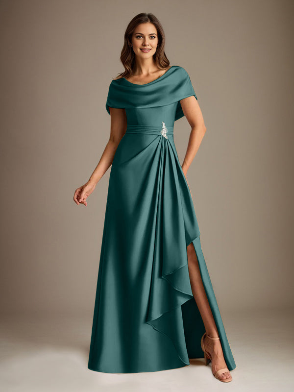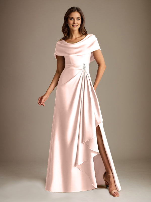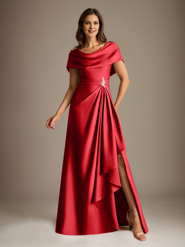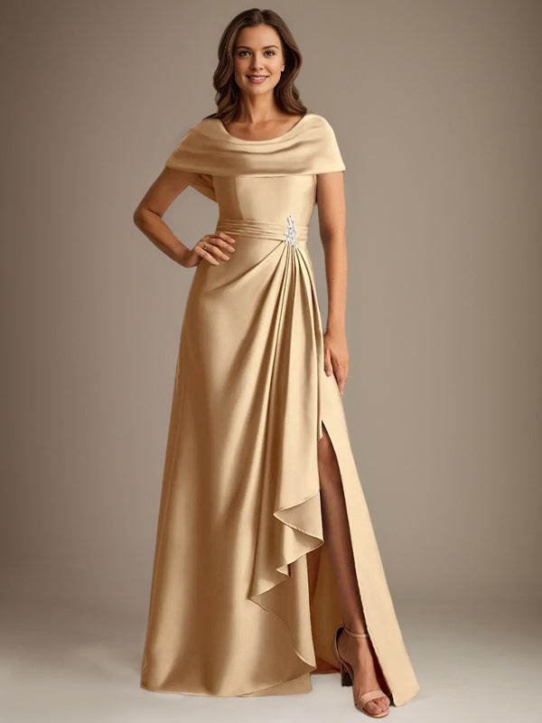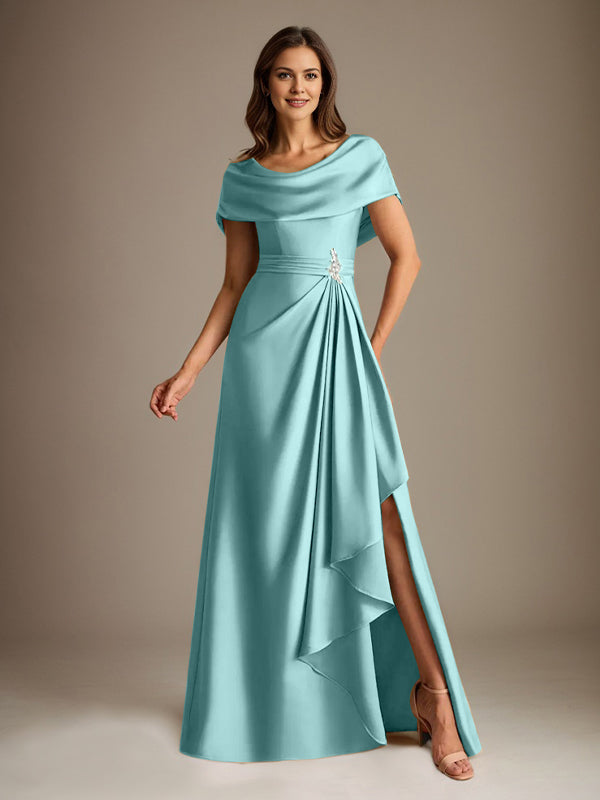 Vestido de madre de la novia de satén elástico, corte A, largo hasta el suelo, con escote redondo y volantes en cascada