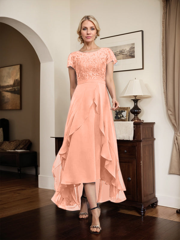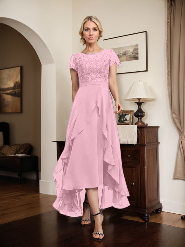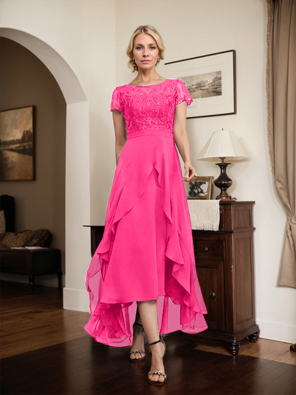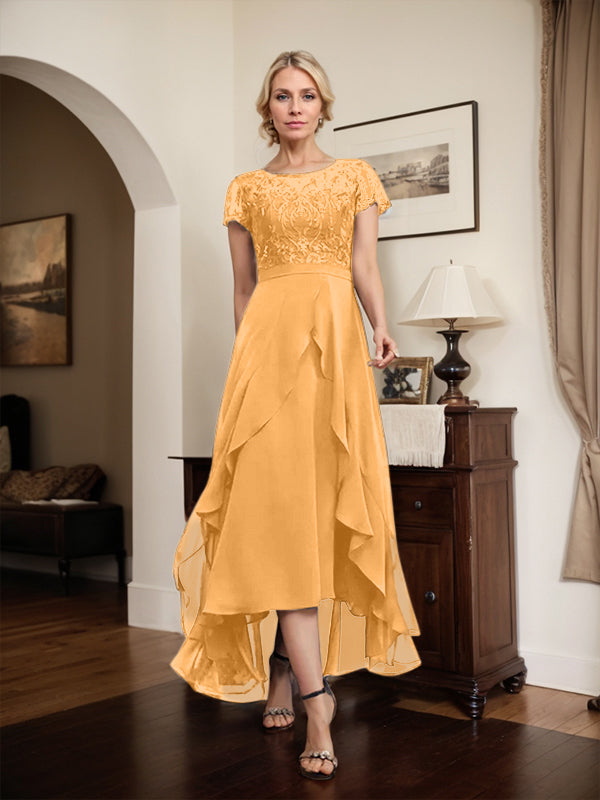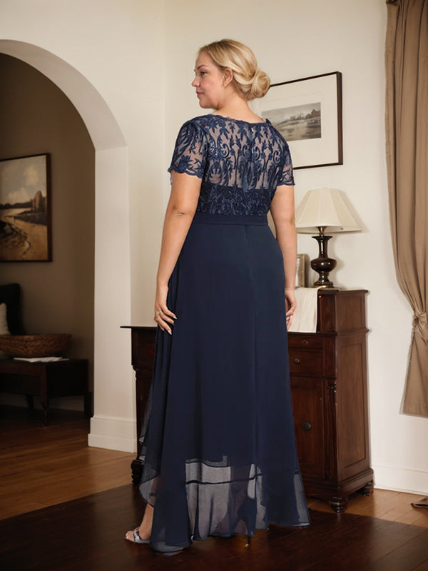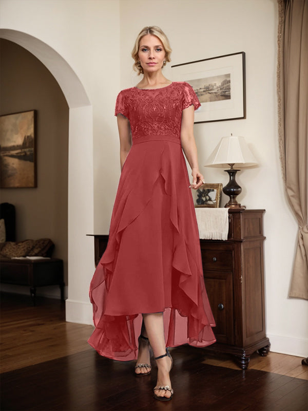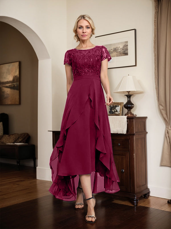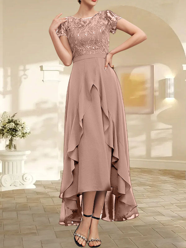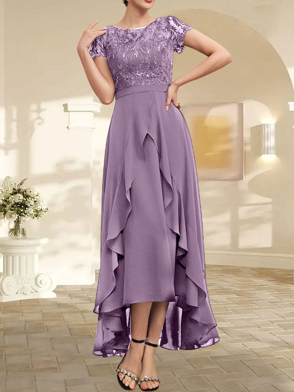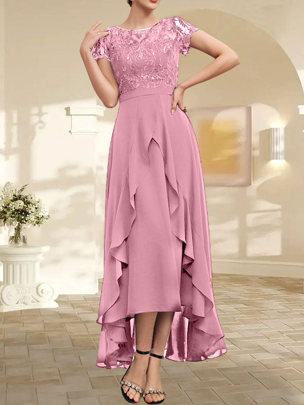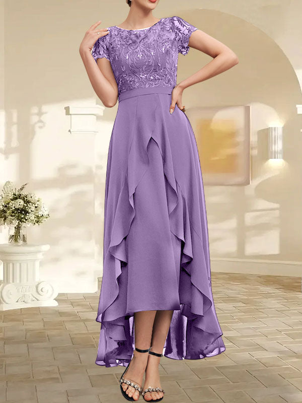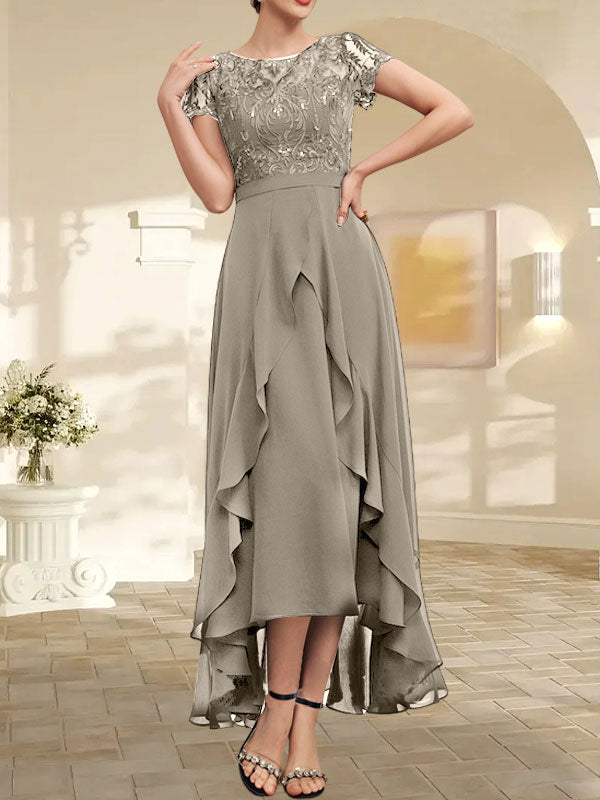 Vestido de madre de la novia de gasa asimétrica con encaje, escote en A, ilusión, lazo, volante y lentejuelas