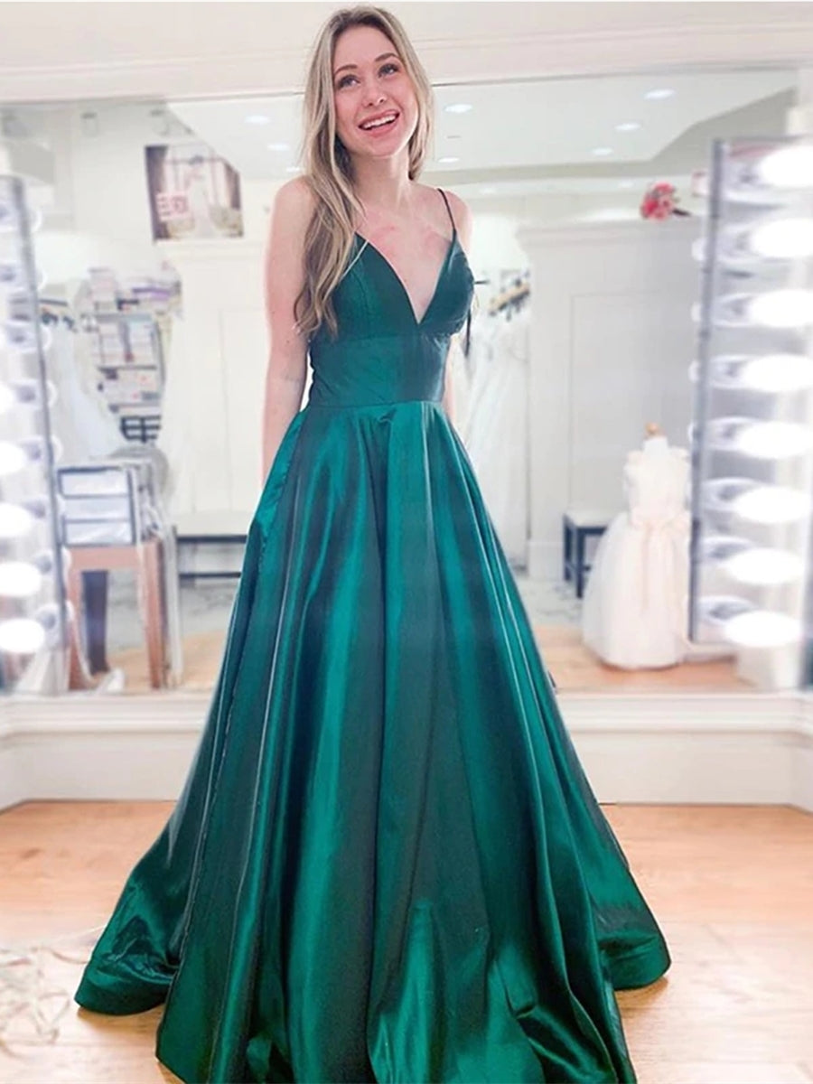 Vestidos de noche formales de satén con escote en V y tirantes finos en línea A