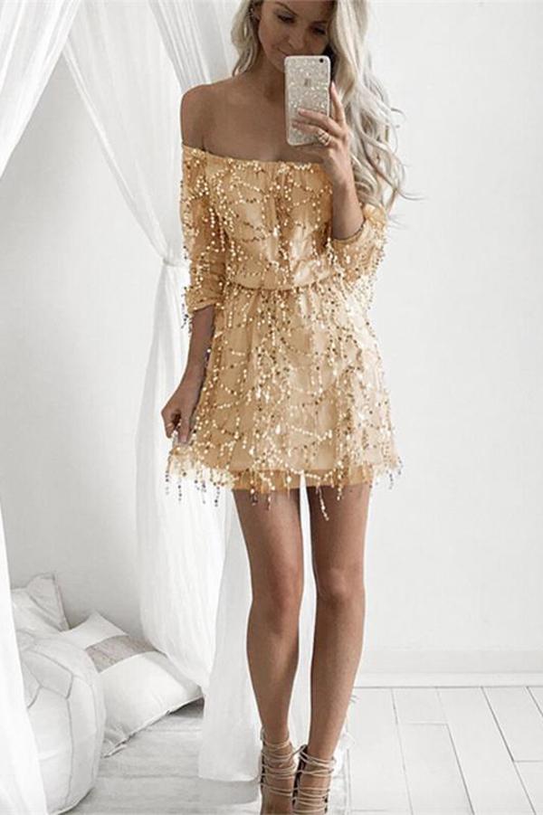 Vestidos de graduación de manga larga con hombros descubiertos y cuentas, vestidos de regreso a casa